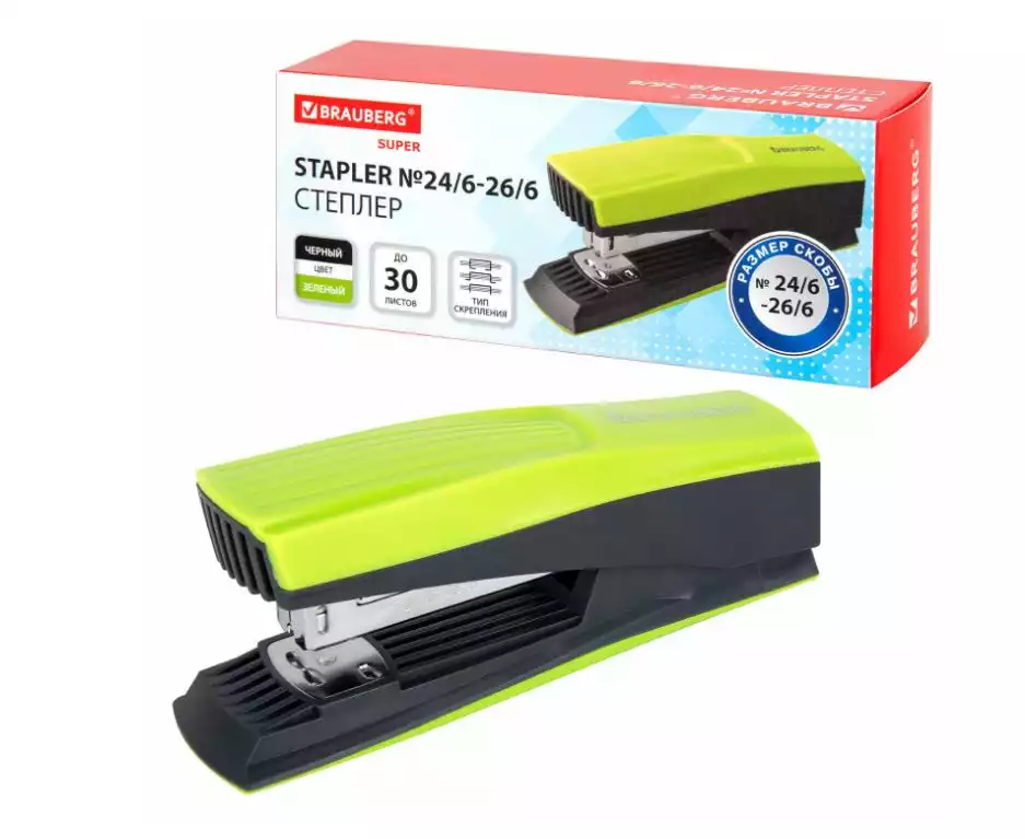 Степлер №24/6, 26/6 BRAUBERG "SUPER", до 30 листов, зелено-черныйBRAUBERG