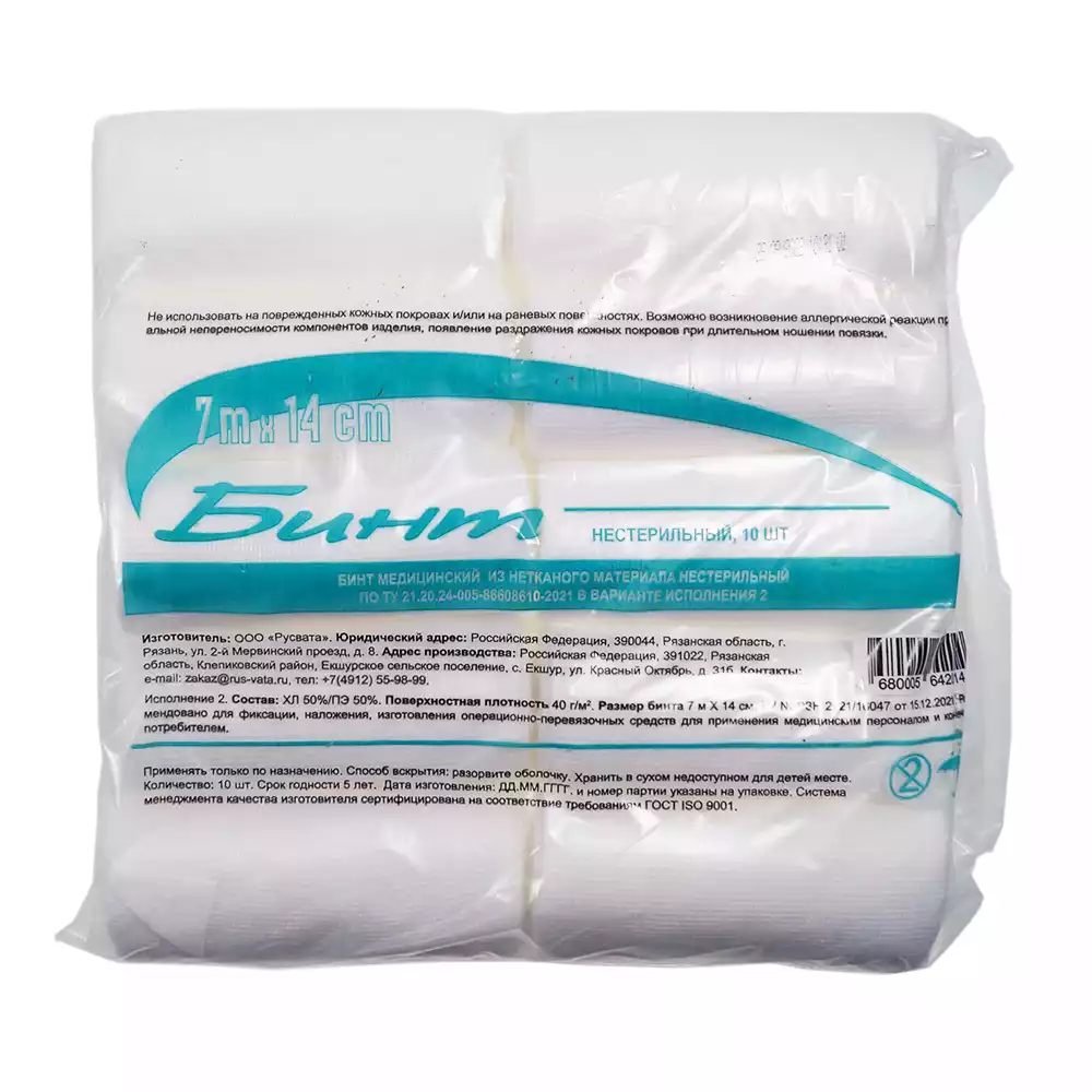 Бинт нетканный, размер 7м*14см (полиэфир 50% + хлопок 50%) нестерильный, групповая упаковкаРусВата (РОССИЯ), 10 шт