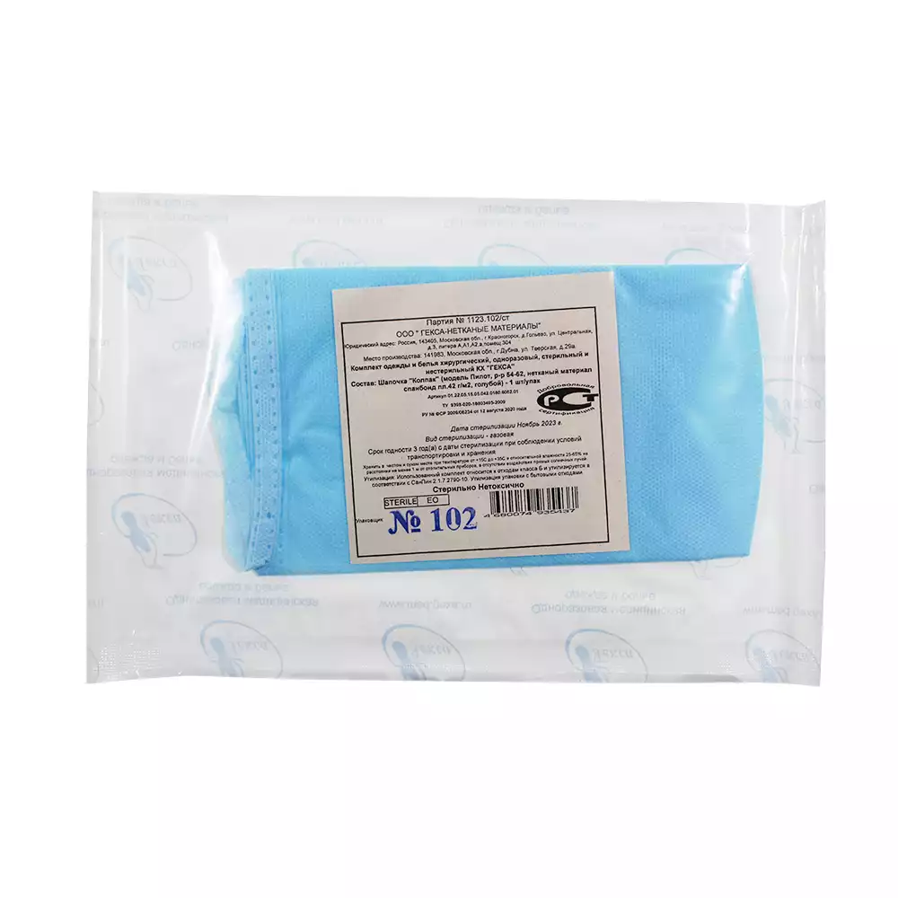 Шапочка-колпак, высота 18см, спанбонд 42г/м2, на завязках, р. 54-62, стерильная, цвет голубойГекса-нетканые материалы (РОССИЯ)