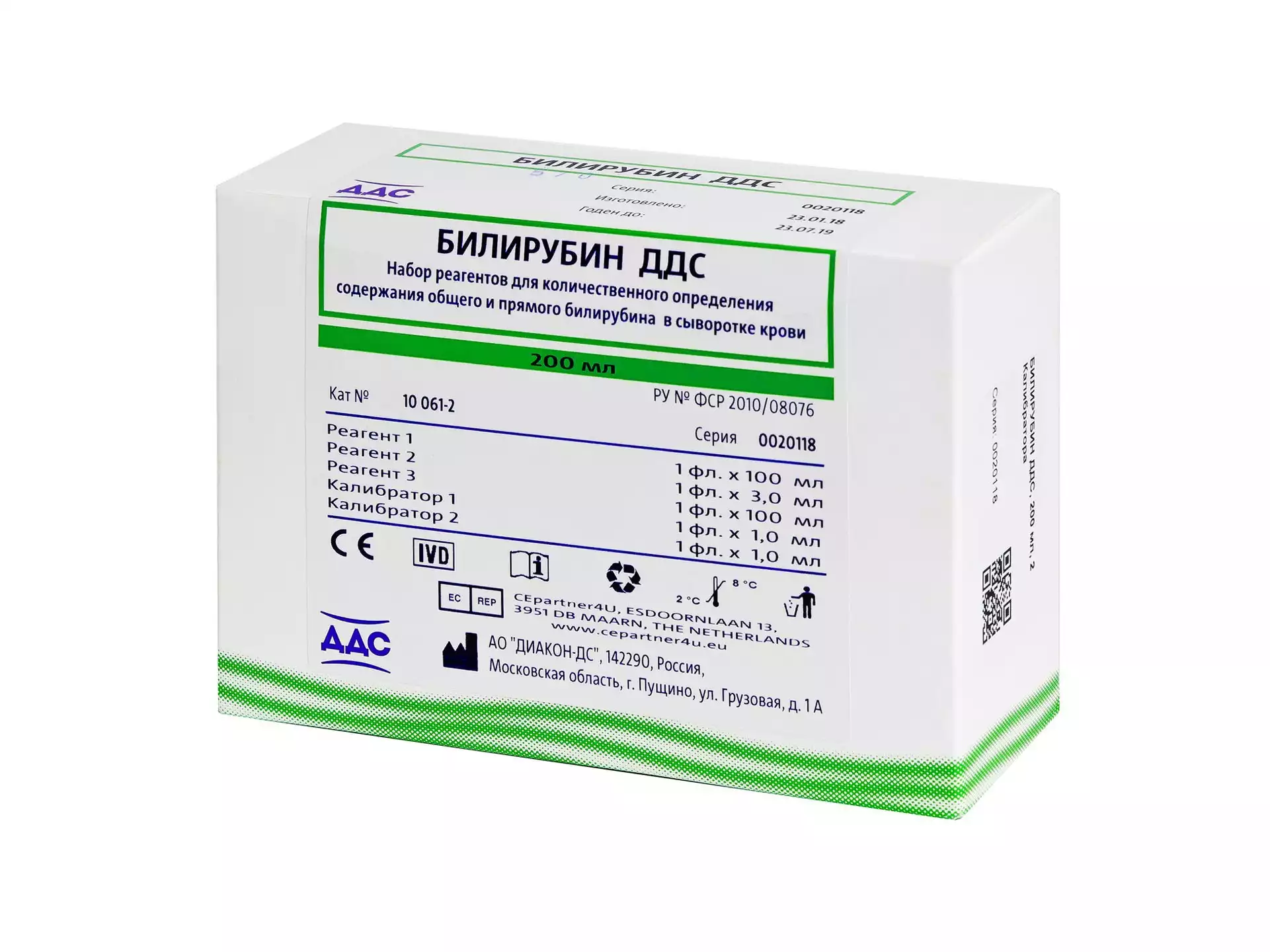 Биохимические реагенты для количественного определения содержания общего и прямого билирубина в сыворотке крови. Метод: Конечная точка. С 2, 4-дихлоранилином (ДХА) для общего. Йендрашика-Грофа для прямого.