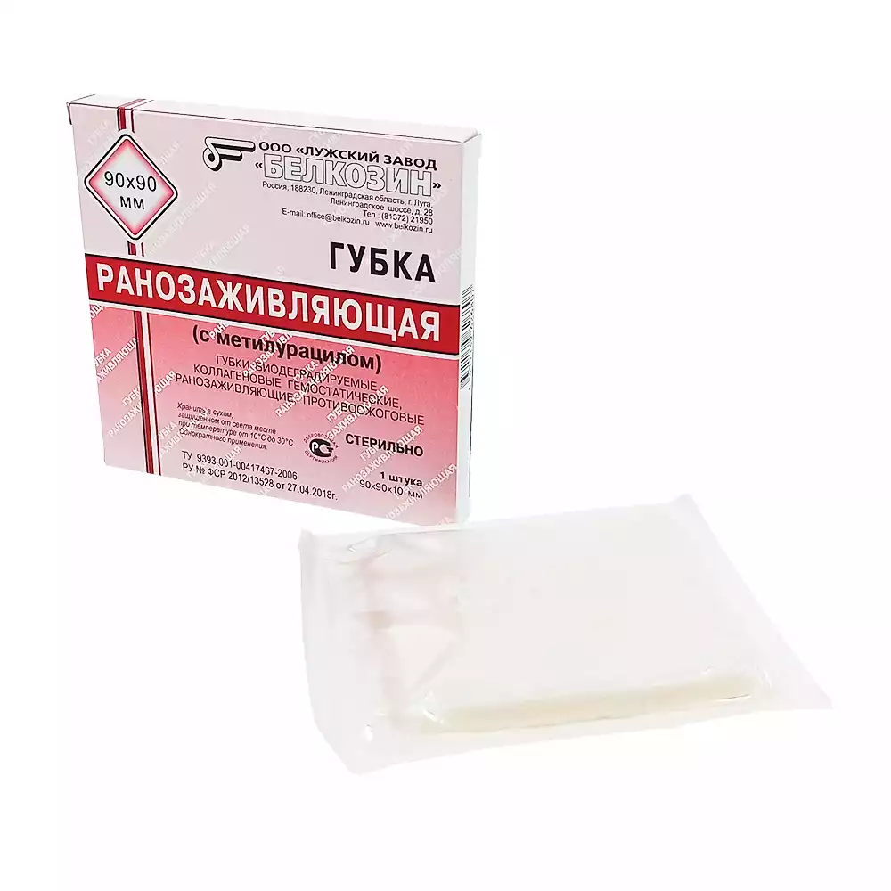 Губка ранозаживляющая представляет собой пластину белого цвета пористой структуры, со специфическим запахом уксусной кислоты, с рельефной поверхностью. Губки ранозаживляющие готовят из раствора коллагена. В состав губки ранозаживляющей входит метилурацил.
