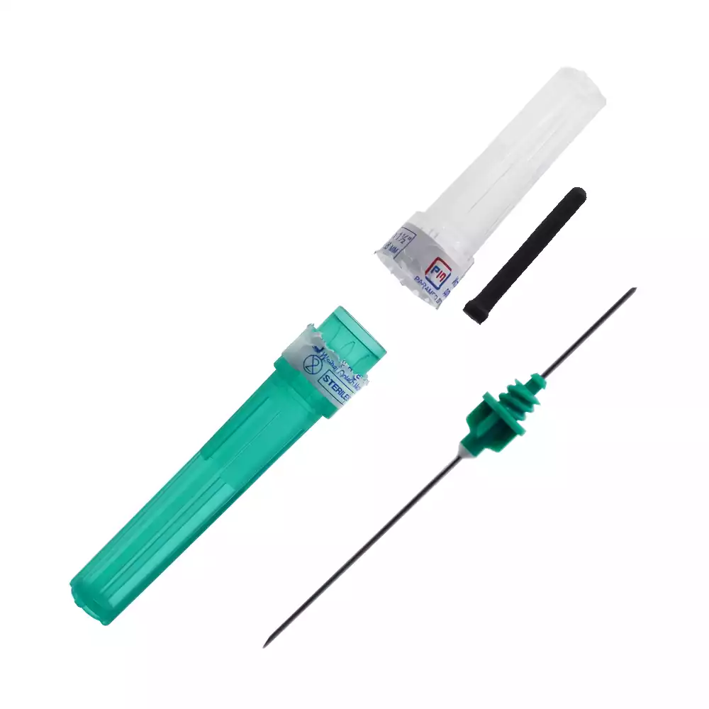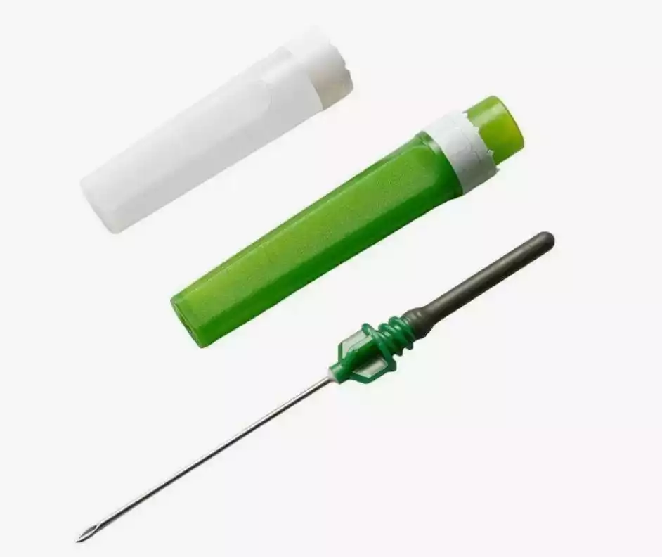 Двусторонняя игла для взятия крови размером 21G с длиной 1,5 дюйма (0,8 на 38 миллиметров) имеет зеленый цветовой маркер, облегчающий идентификацию.