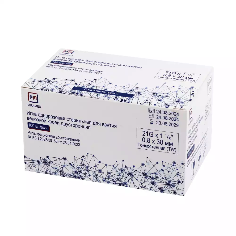 Игла 2-сторонняя 21Gх1 1/2 (0,8*38мм), цвет зеленый, 100 шт