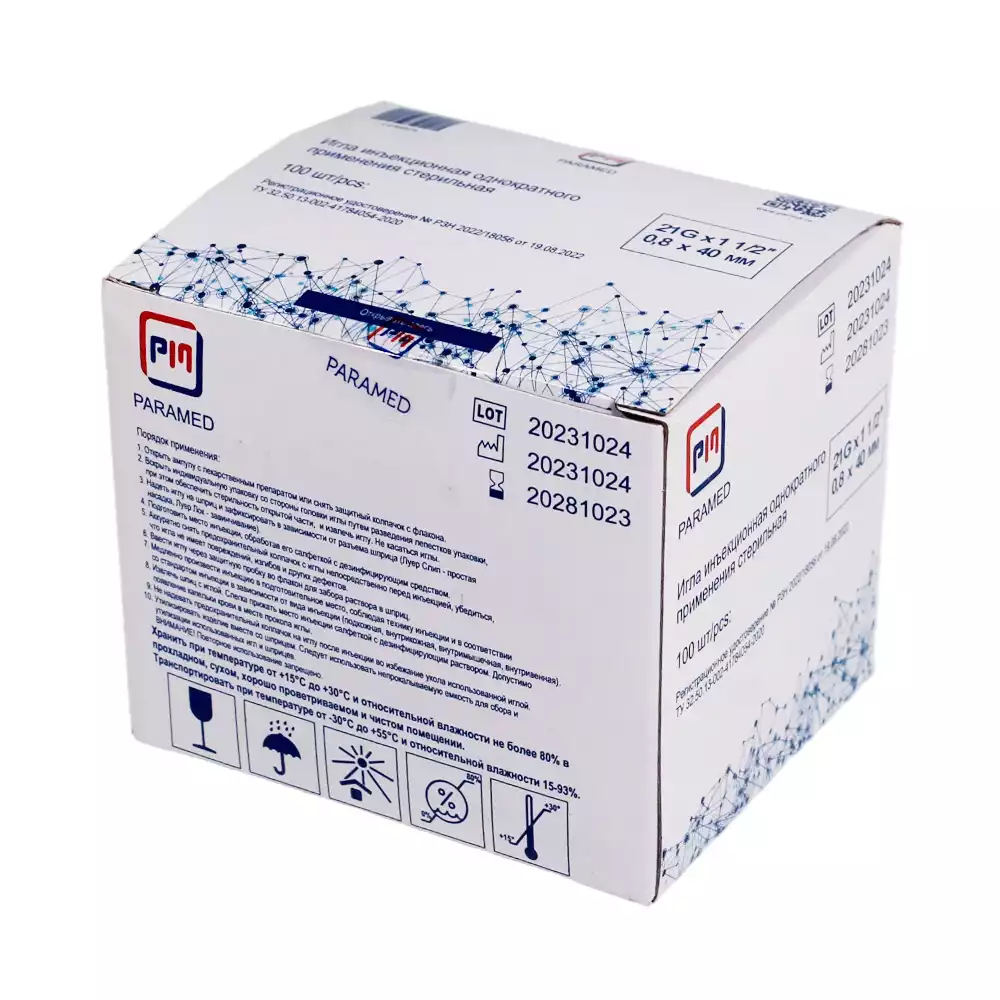 Иглы инъекционные однократного применения стерильные для шприцов PARAMED 21G (0,8х40мм).