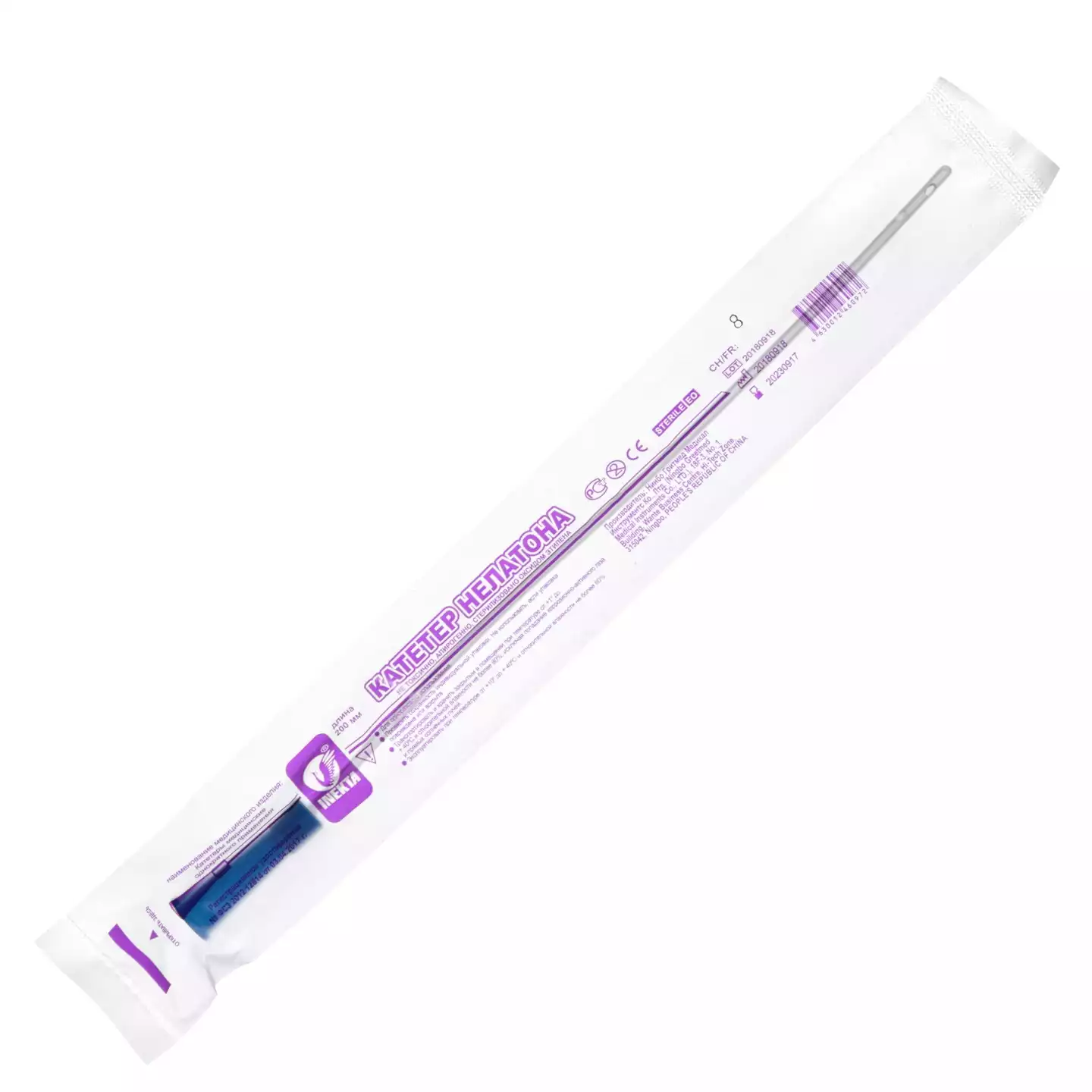 Катетер Нелатона характеризуется гладкой гидрофильной поверхностью, минимизирующей трение и дискомфорт. Атравматичный дистальный конец имеет закрытую форму с двумя боковыми дренажными отверстиями. Такое конструктивное решение обеспечивает эффективный отток мочи и снижает риск возможной закупорки просвета катетера.