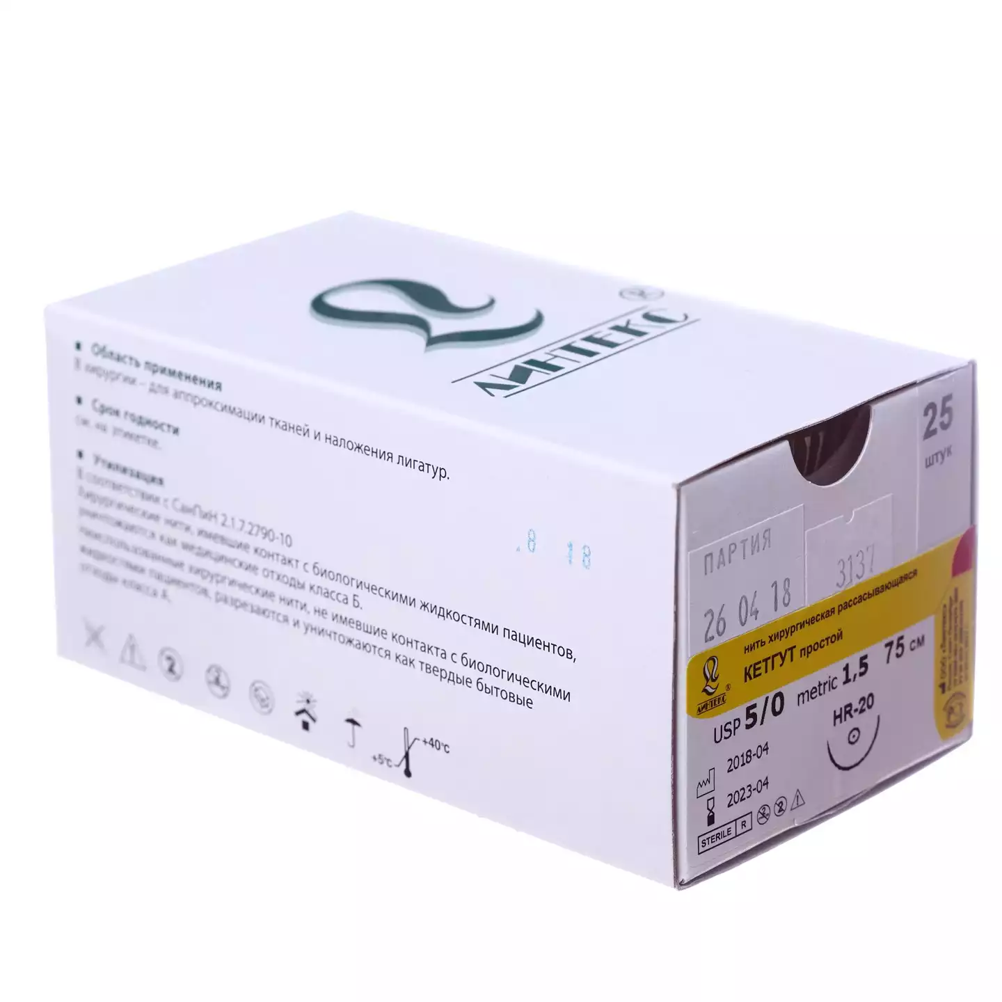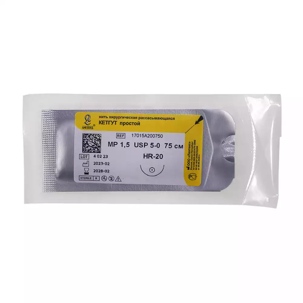Кетгут 5/0, длина нити 75см, игла HR-20 колющая 20 мм