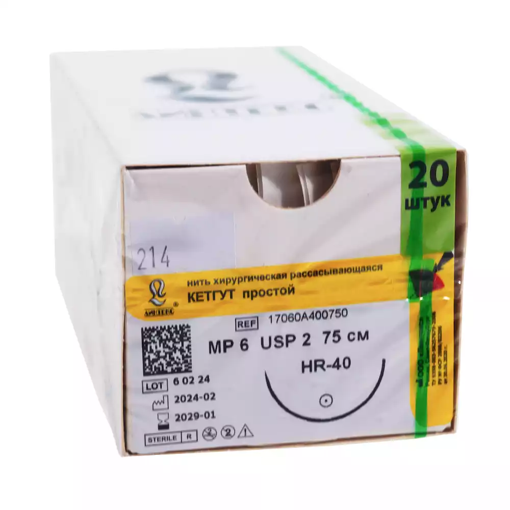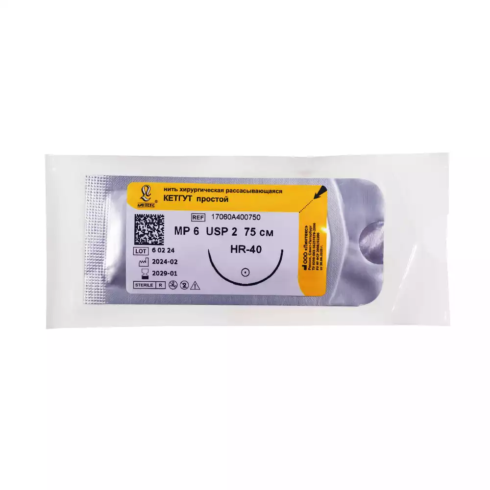 Кетгут простой USP-2 (MP6), длина нити 75см, игла колющая, изгиб 1/2 окружности, длина 25мм, стерильный