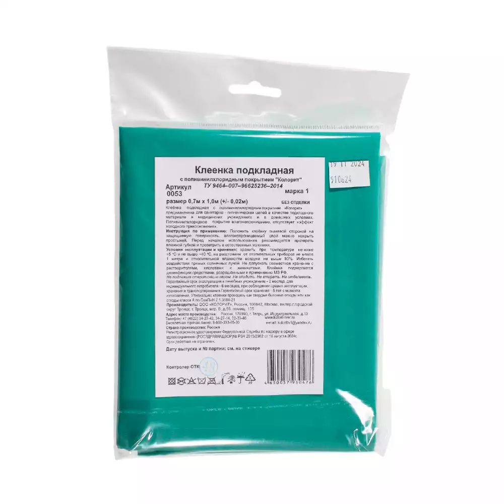 Клеёнка подкладная Колорит, размер 0,7м*1,0м, с ПВХ покрытием, без окантовки, цветная в ассортименте (зеленый)