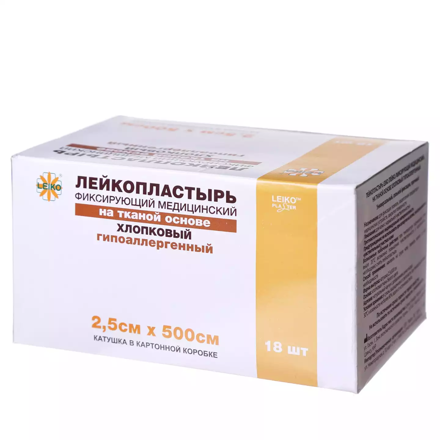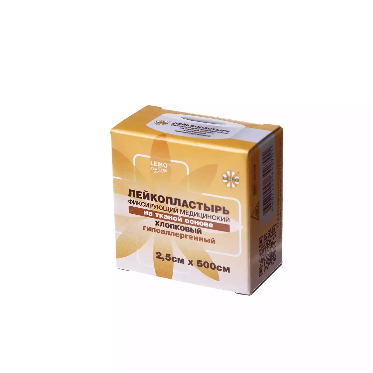 Лейкопластырь LEIKO, на тканевой хлопковой основе,фиксирующий, размер 2,5см*500см, гипоаллергенный, катушка в картонной коробке
