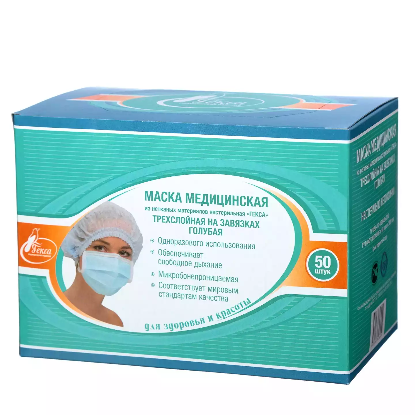 Маска 3-х слойная, с носовым фиксатором 10см, на завязках, нестерильная, голубая, 50 шт