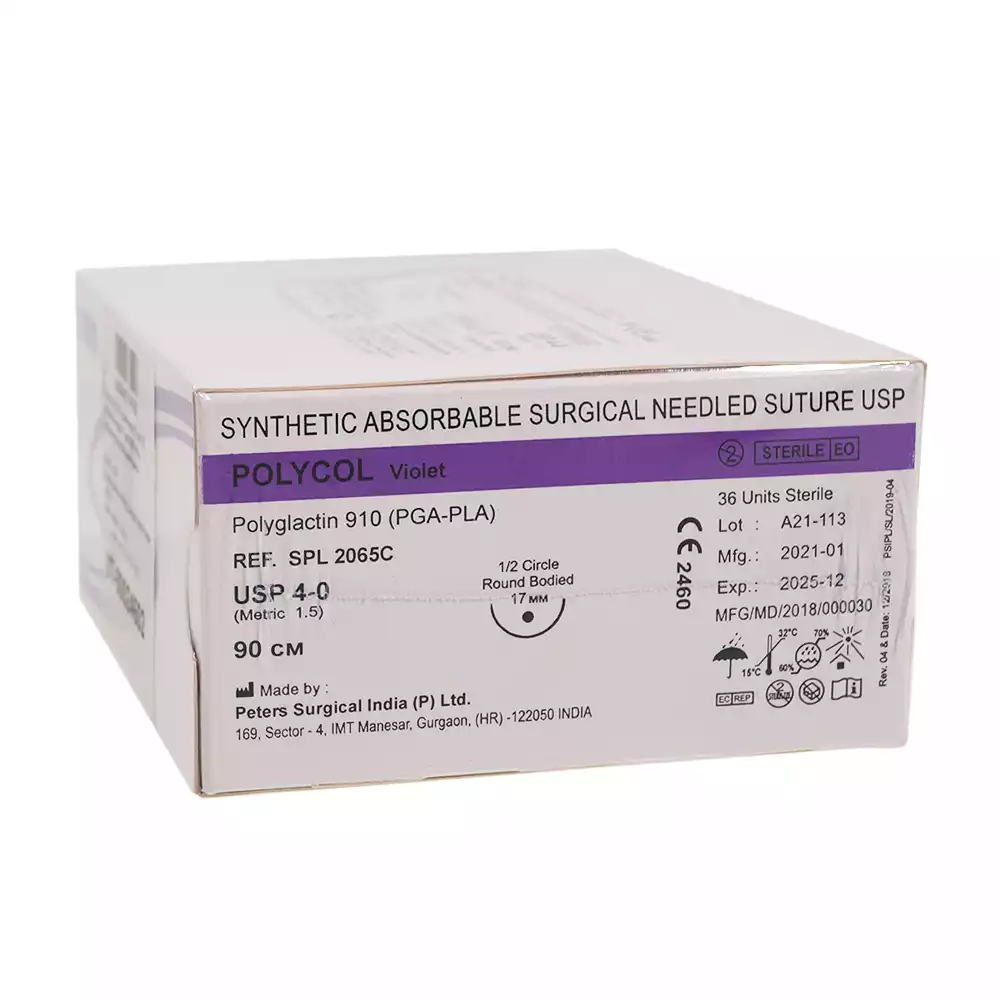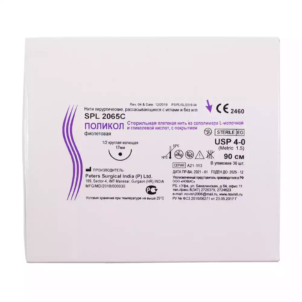 Поликол 4/0 (1,5), длина нити 75см, игла 1/2 круглая колющая 17мм, упаковка 36шт, SPL2065