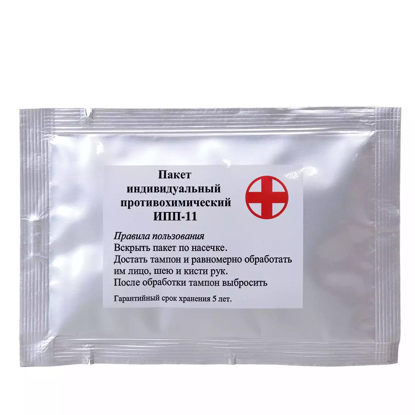 Пакет ИПП-11 являет собой герметичный пакет, содержащий тампон, выполненный из нетканых материалов и пропитанный противохимическими средствами.