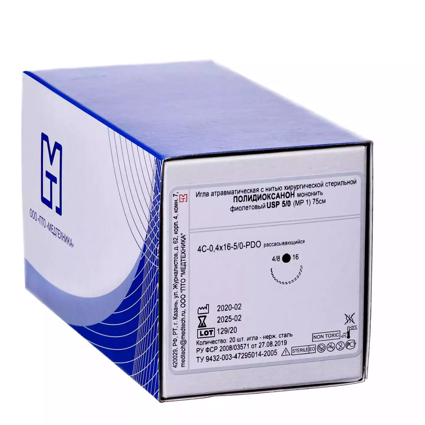 Полидиоксанон мононить USP 5/0 (МР1), длина нити 75см, 4C-0,4х16-5/0-PDO цвет фиолетовый, 20 шт