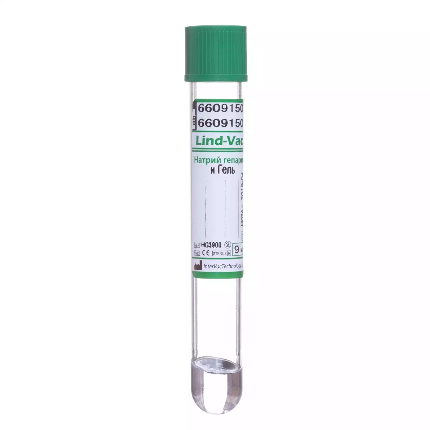 Пробирка вакуумная Lind-Vac для взятия крови с натрий гепарином с разделительным гелем, объем 9 мл, размер 16*100мм пластик, цвет зеленый., 50 шт