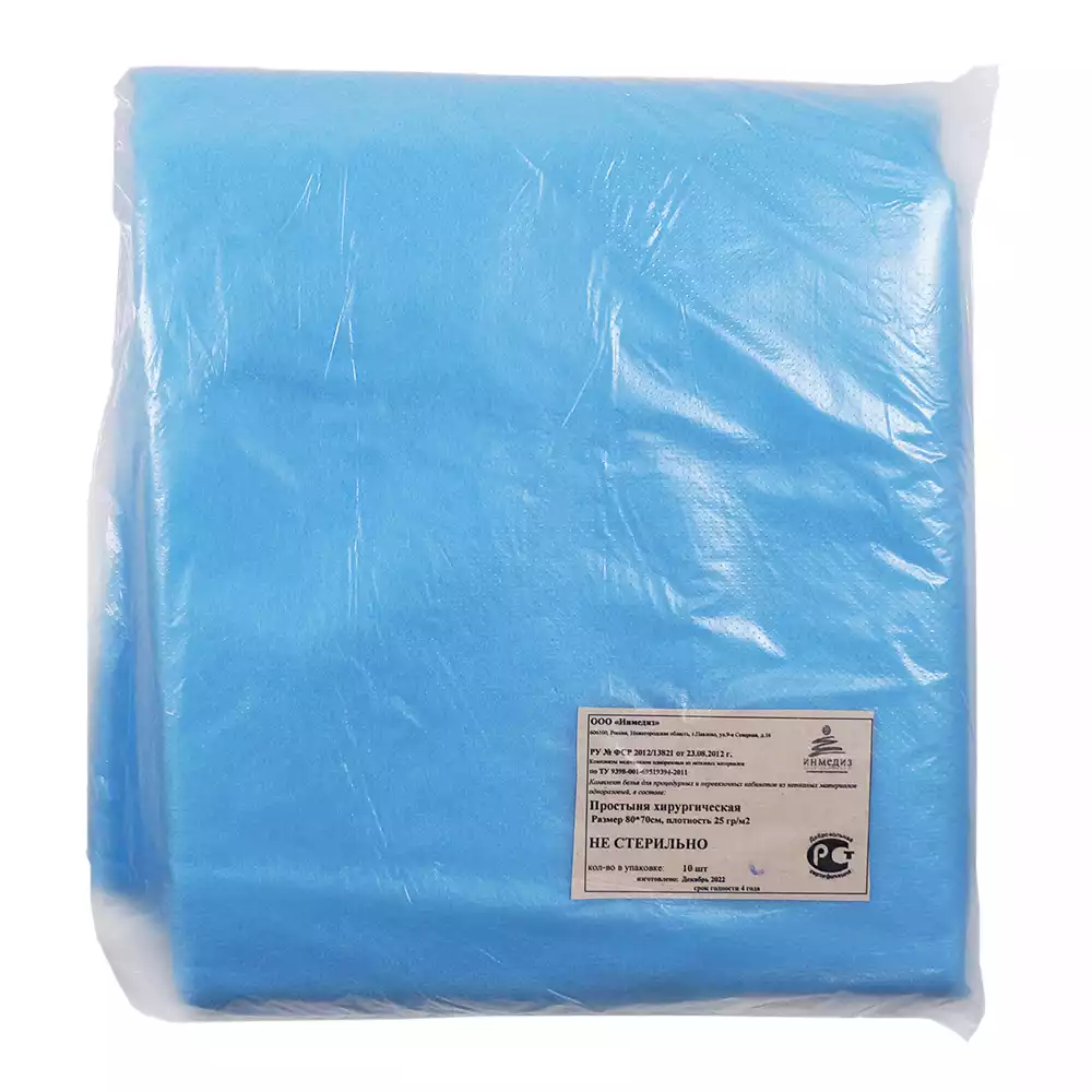 Простыня хирургическая, операционная, не стерильная. Изготовлена из комбинированного 3-хслойного нетканого материала: внешние слои – спанбонд, водоотталкивающие слои, внутренний – мельтблаун, водостойкие слои, бактериальный барьер, повышает прочность. Размер 70х80 см. Плотность не менее 25г/кв.м. Упакована в полиэтиленовый пакет по 10 штук.