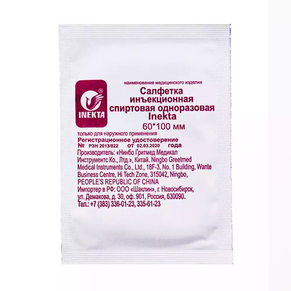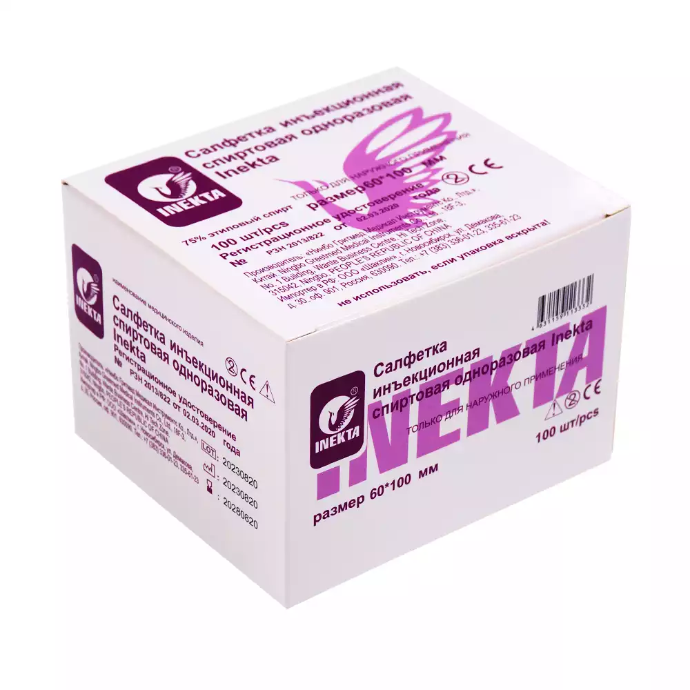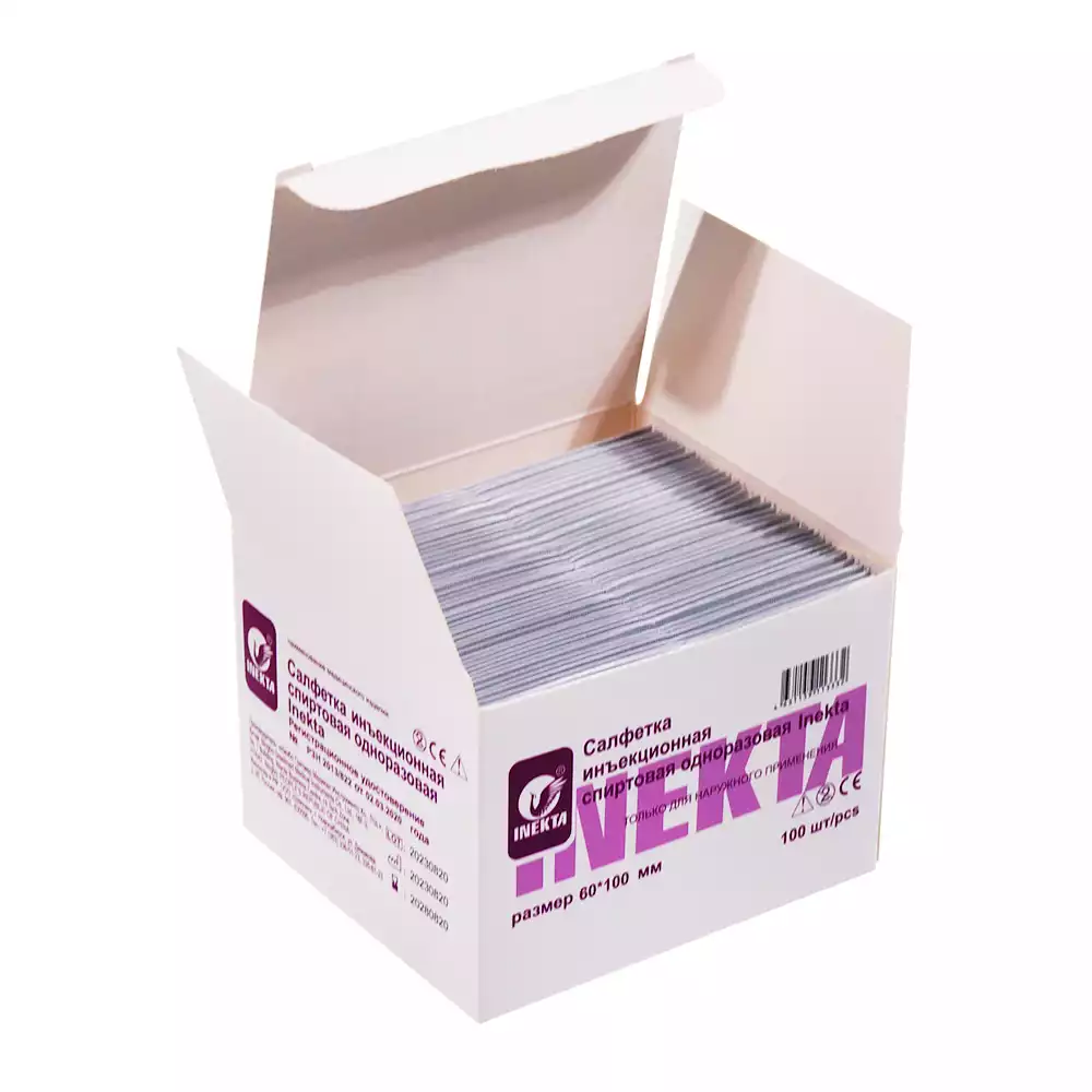 Салфетка инъекционная спиртовая одноразовая inekta размером 60х100 мм предназначена для местного применения в качестве антимикробного и дезинфицирующего средства при обработке кожных покровов (дезинфекции мест проколов) до и после постановки инъекций, заборов крови, мелких порезов и ссадин, а также для гигиенической и санитарной обработки рук и дезинфекции небольших поверхностей.