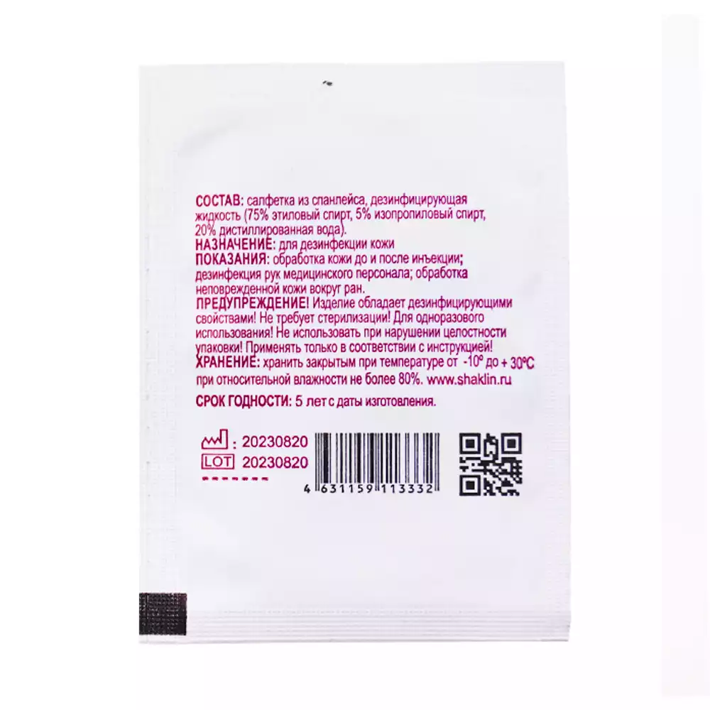 Салфетка спиртовая антисептическая для инъекций, размер 60*100мм, 75% этиловый спирт