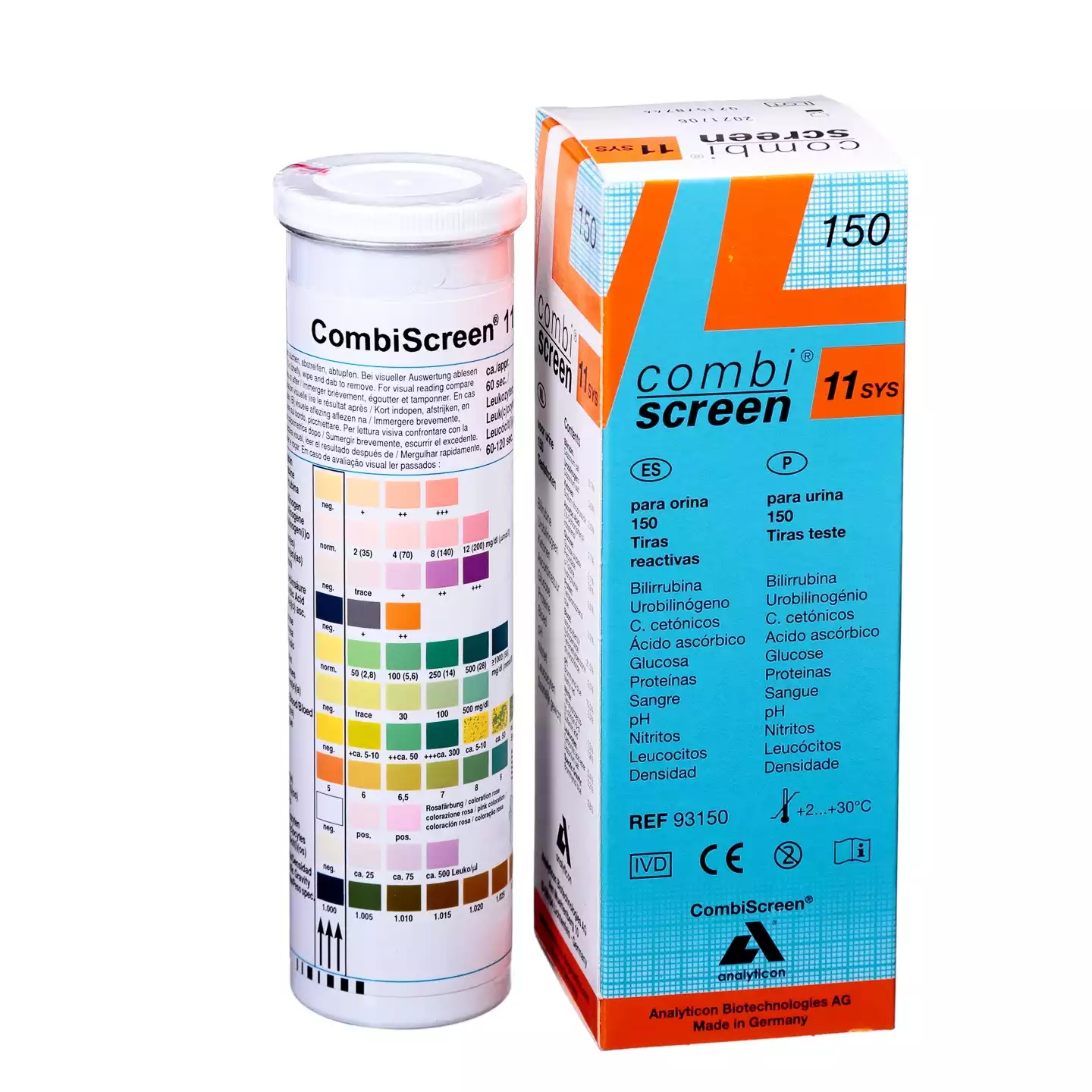 Тест-полоски Комби Скрин 11 парметров COMBI SCREEN® 11SYS 150шт (93150) - это тест-полоски для качественного и полуколичественного определения клеточных и низкомолекулярных биохимических компонентов и анализа физико-химических свойств мочи производства Analyticon Biotechnologies AG (Германия). Тест-полоски Analyticon предназначены для визуального считывания и не требуют специальной преаналитической подготовки мочи.