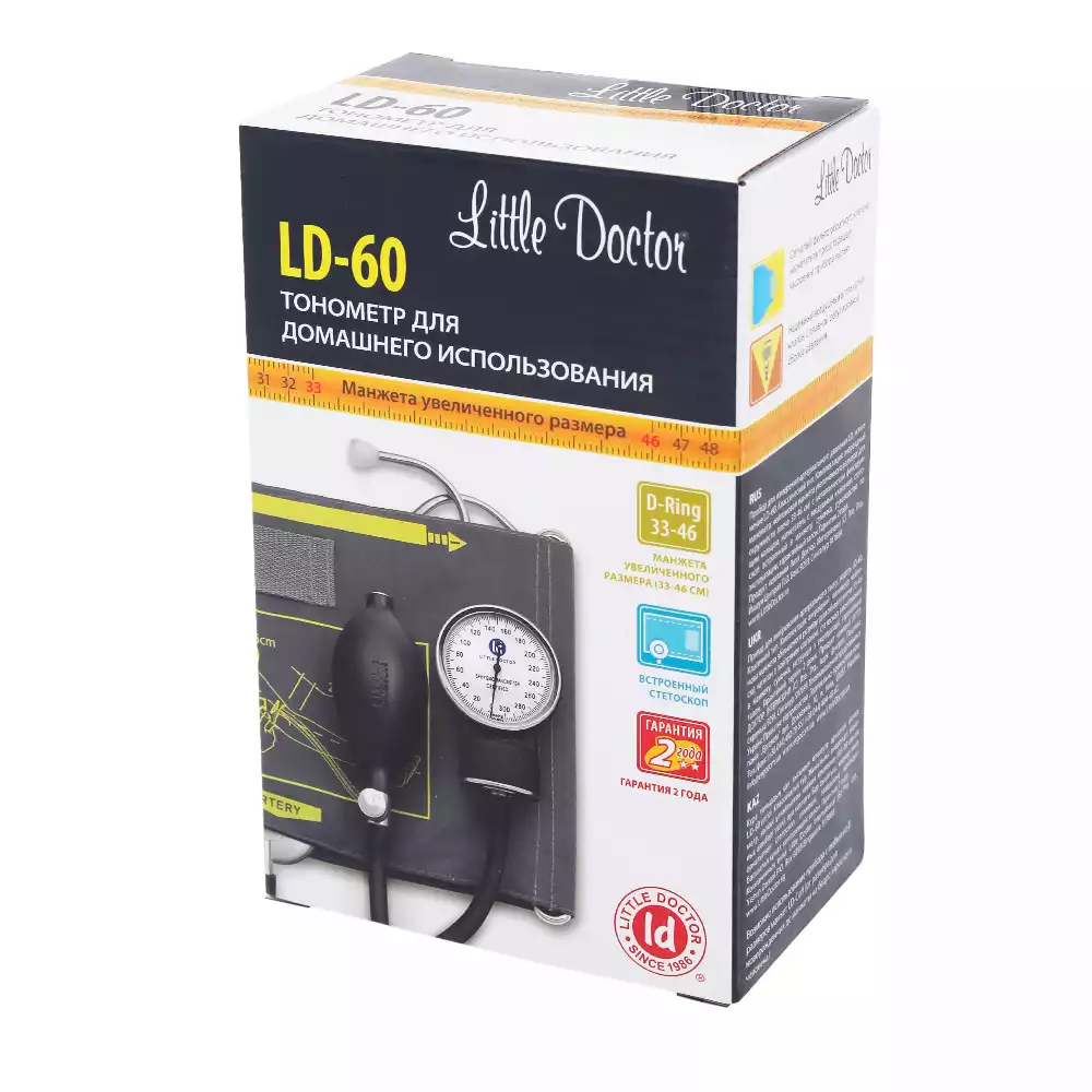 Изготовлены все составляющие части механического тонометра LD-60 из гипоаллергенных материалов без латекса. В манжету встроен металлический стетоскоп. Манометр имеет шкалу для измерения артериального давления в диапазоне 20 – 300 мм рт.ст. Тонометр Little Doctor LD-60 с большой манжетой (33-46 см) – это прибор классического типа, посредством которого можно держать под постоянным контролем артериальное давление. Весь процесс измерения базируется на методике Короткова. Тонометр подходит для использования в домашних условиях и учреждениях медицинского типа.