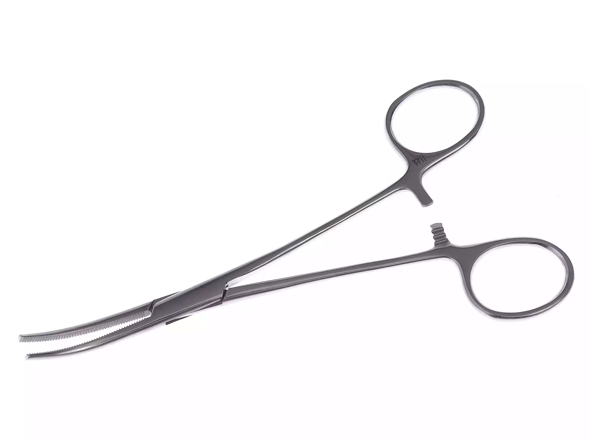 Зажим З-53 кровоостанавливающий, зубчатый, изогнутый №1-для захватывания и зажима сосудов. Длина 158 мм